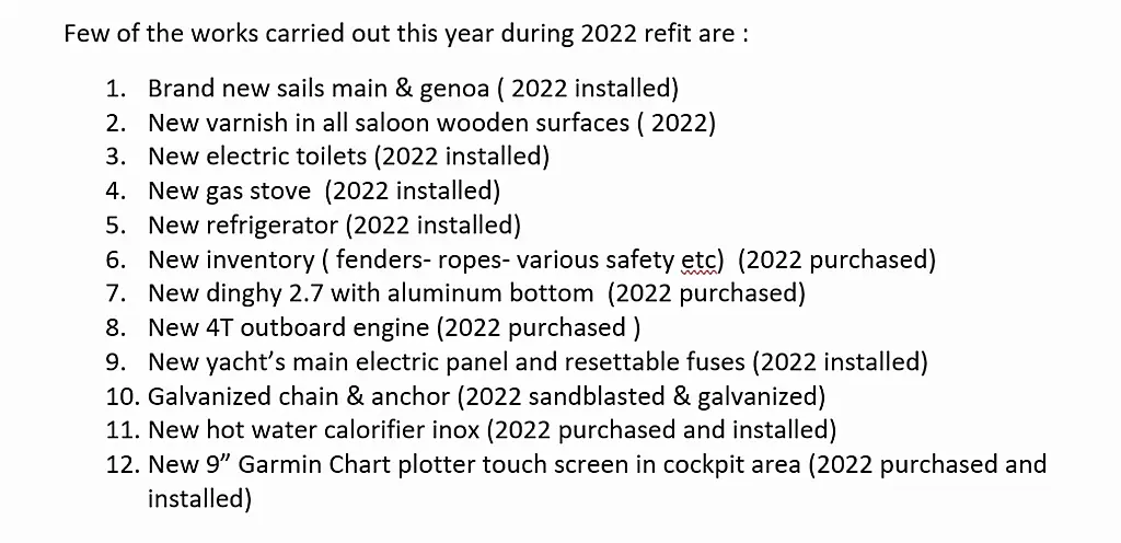 Dinghy , Electric toilet , Solar Panels , Inverter , Teak Cockpit , Teak deck