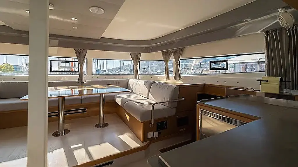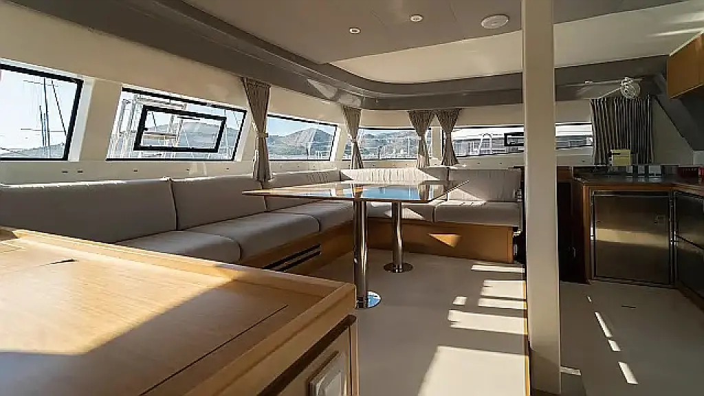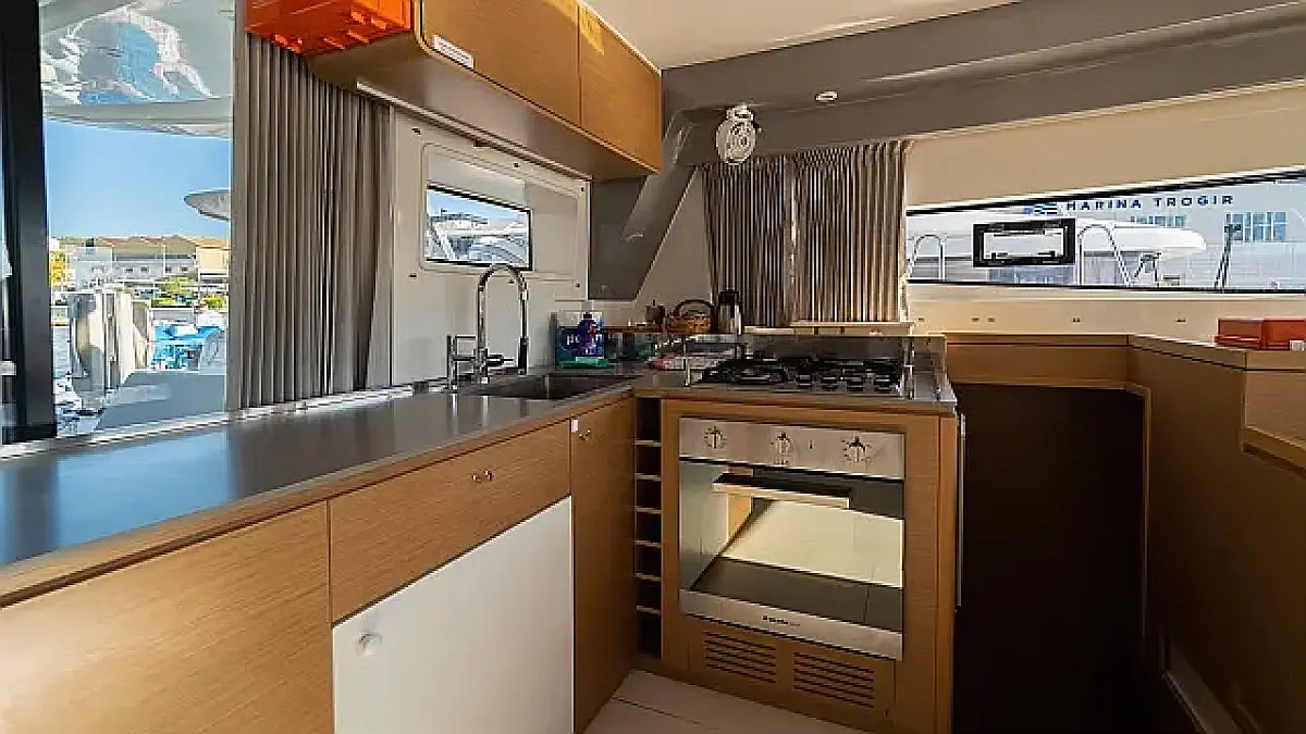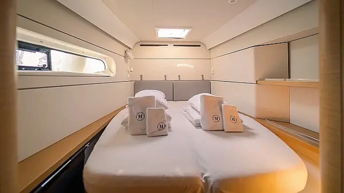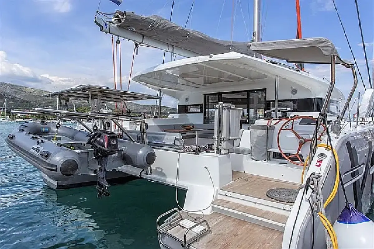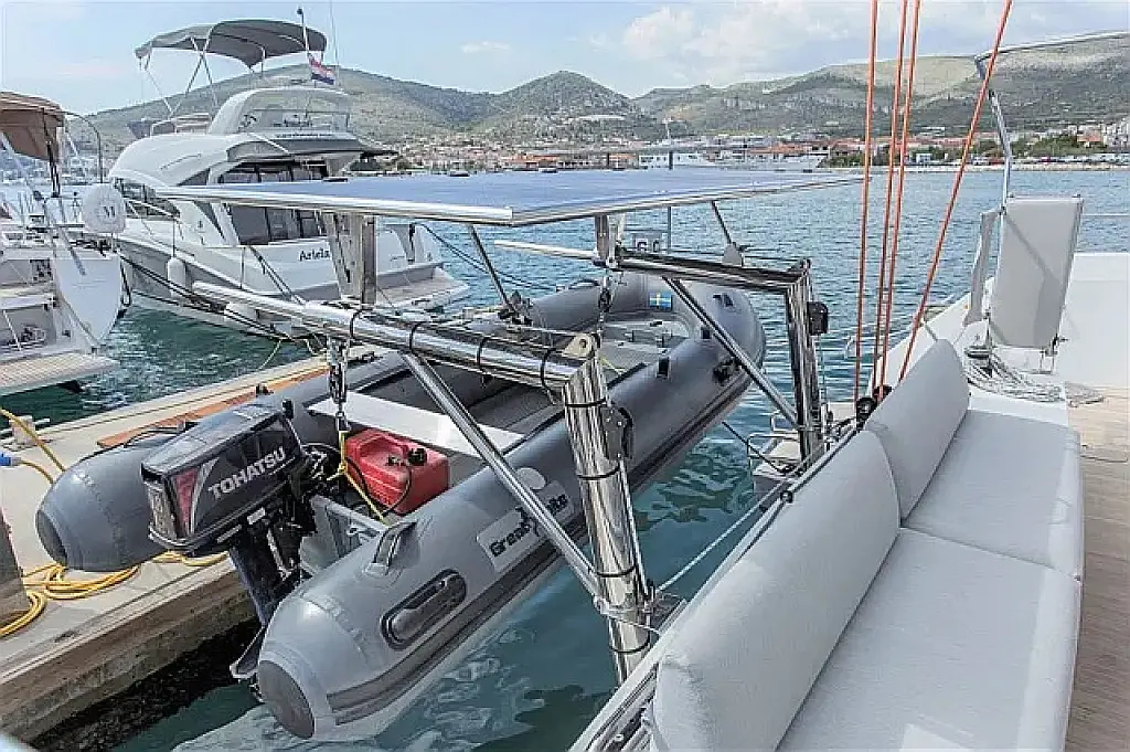 Klima , Bimini , Jastuci u kokpitu , Zvučnici u kokpitu , Pomoćni čamac , Aparat za kavu , Hladnjak , Električni WC , Generator , Grijanje , Crni tank , Ledomat , Inverter , Vanbrodski motor , Solarni paneli , Desalinizator , Wi-Fi i internet