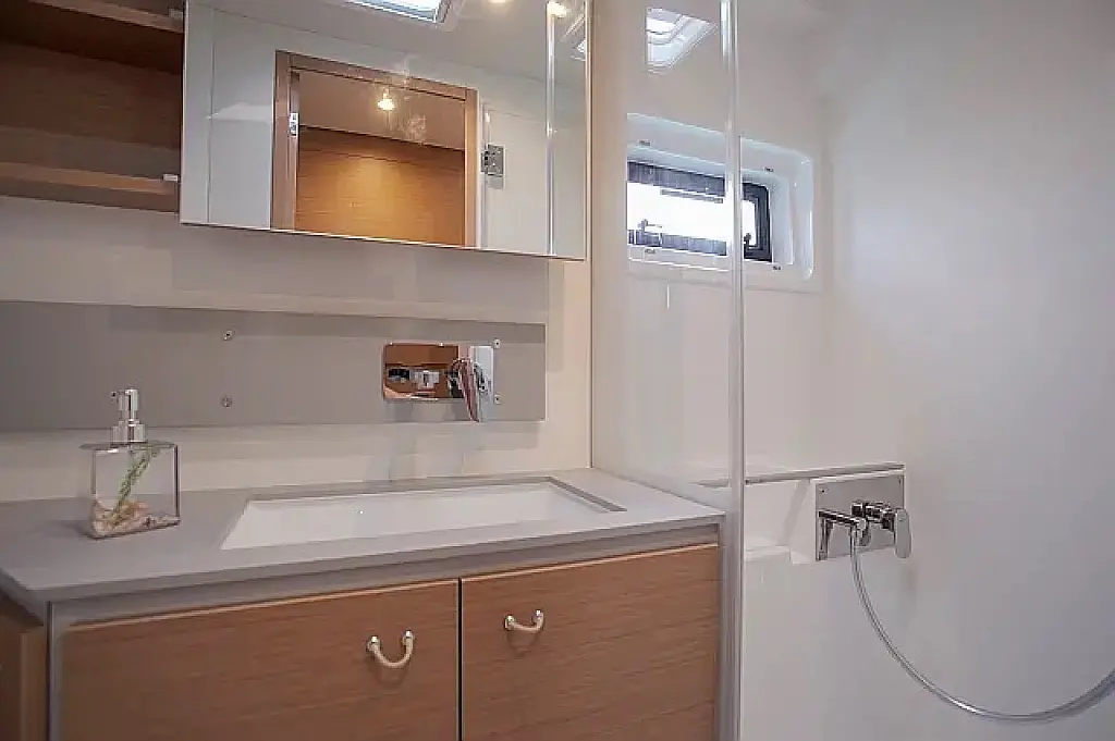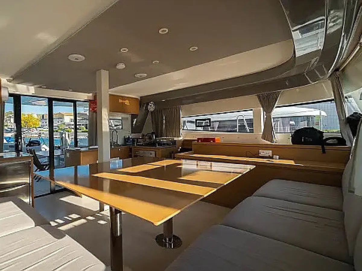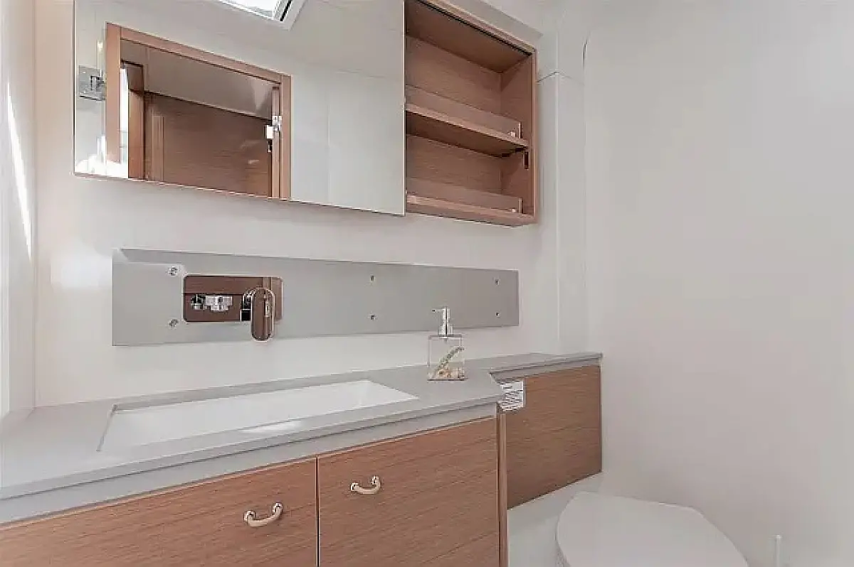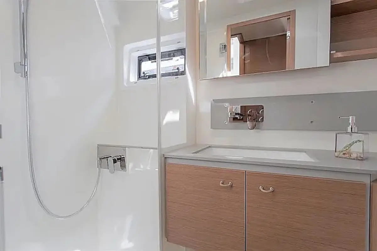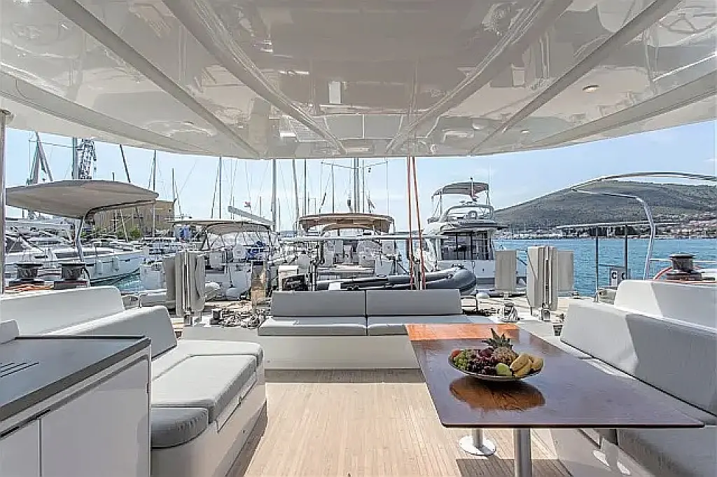 Klima , Bimini , Jastuci u kokpitu , Zvučnici u kokpitu , Pomoćni čamac , Aparat za kavu , Hladnjak , Električni WC , Generator , Grijanje , Crni tank , Ledomat , Inverter , Vanbrodski motor , Solarni paneli , Desalinizator , Wi-Fi i internet