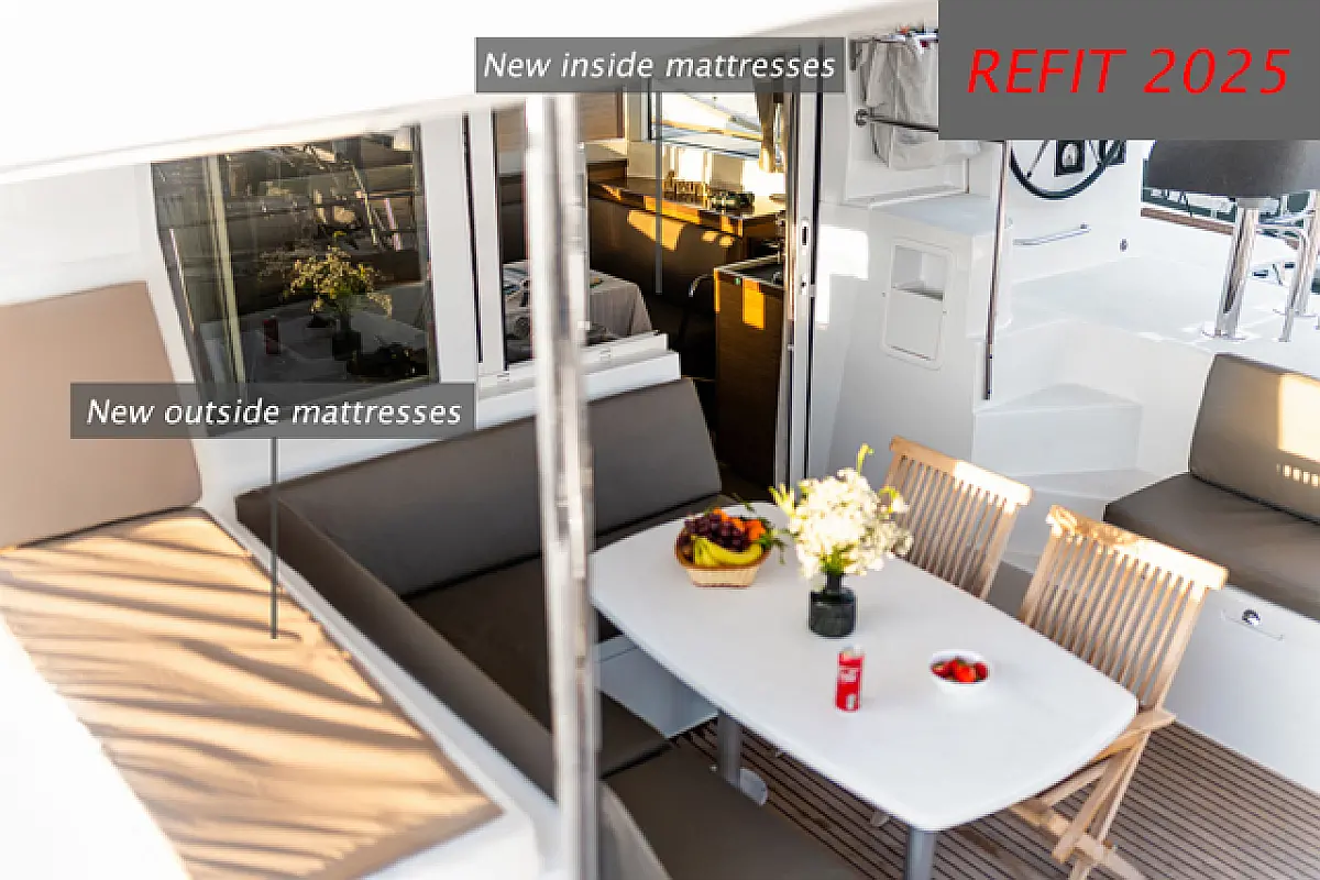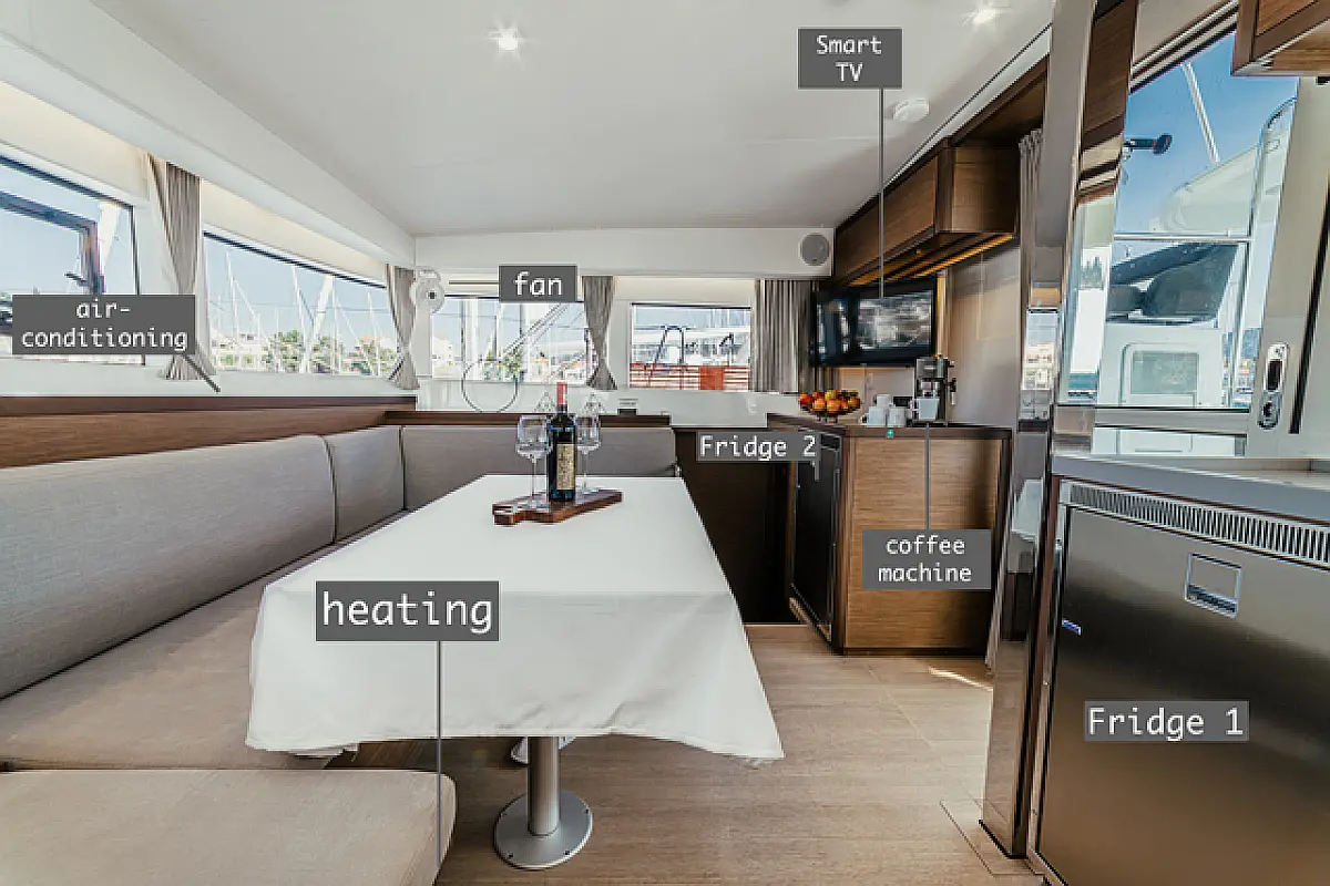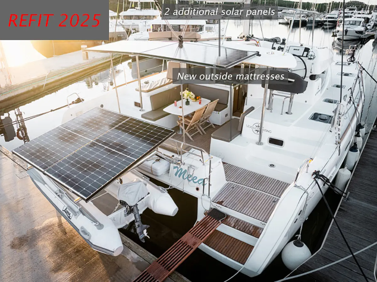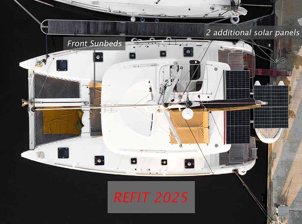 Air condition																		, Coffee maker																		, Cockpit cushions																		, Dinghy																		, Electric winches																		, Electric toilet																		, Ice maker																		, Holding tank																		, Inverter																		, Bimini																		, Solar Panels																		, Sprayhood																		, Teak Cockpit																		, Heating