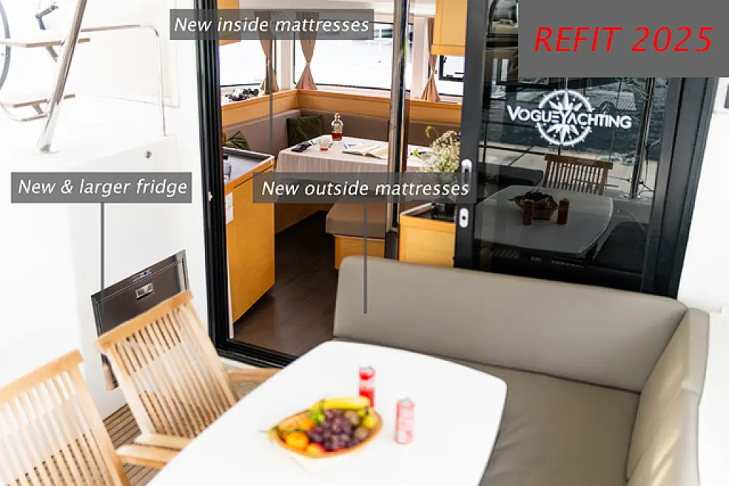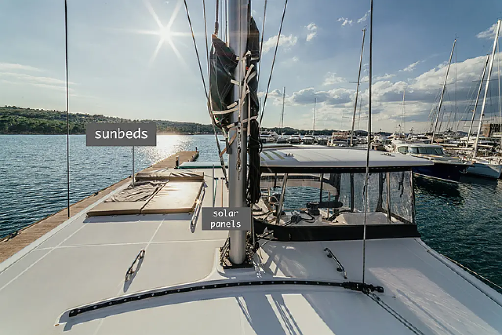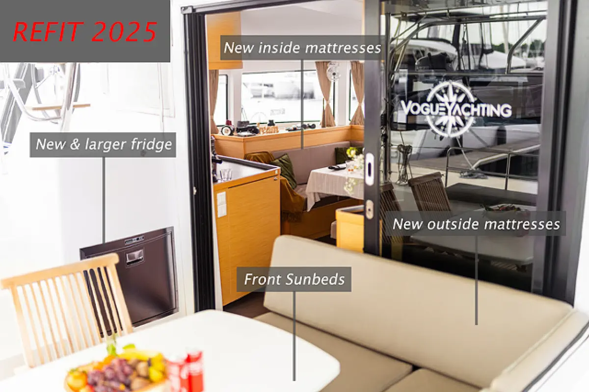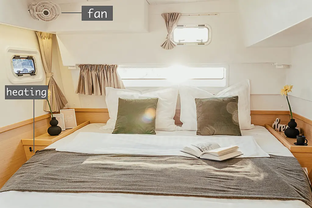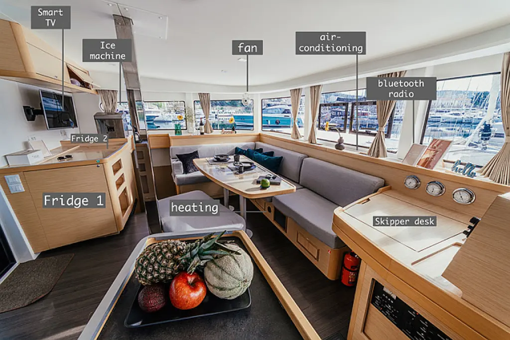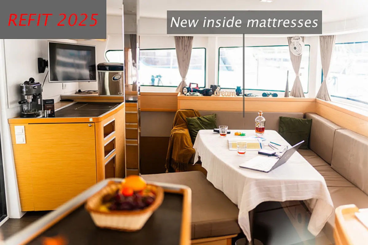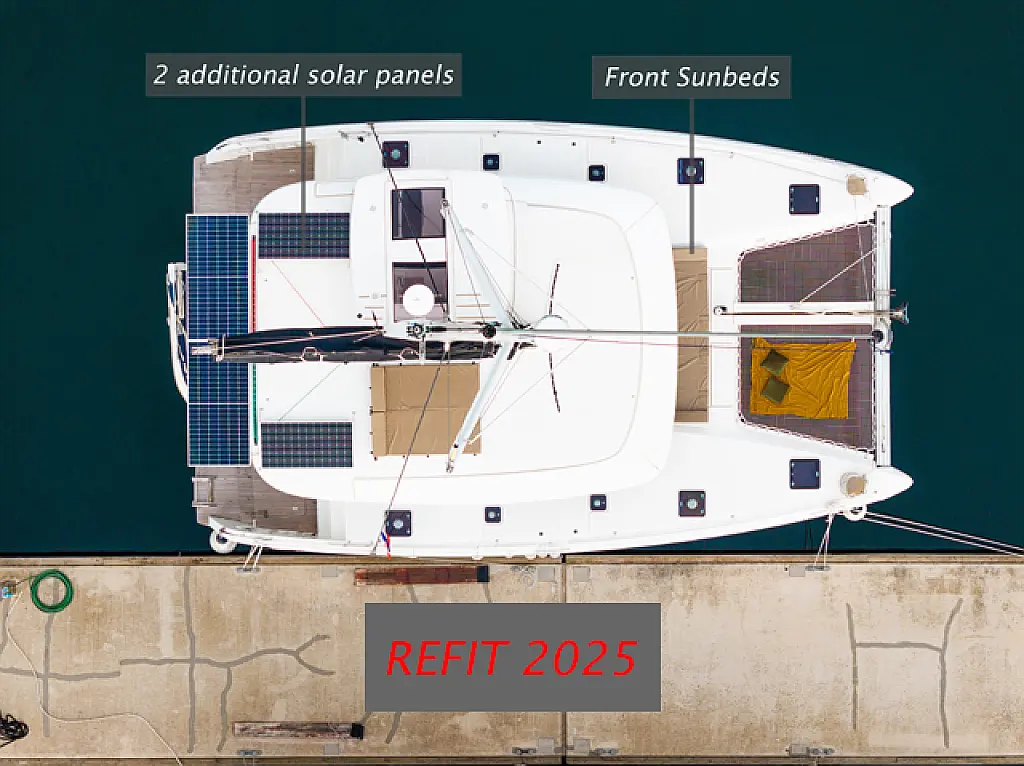 Air condition																		, Coffee maker																		, Cockpit cushions																		, Dinghy																		, Electric winches																		, Electric toilet																		, Ice maker																		, Holding tank																		, Inverter																		, Bimini																		, Solar Panels																		, Sprayhood																		, Teak Cockpit																		, Heating