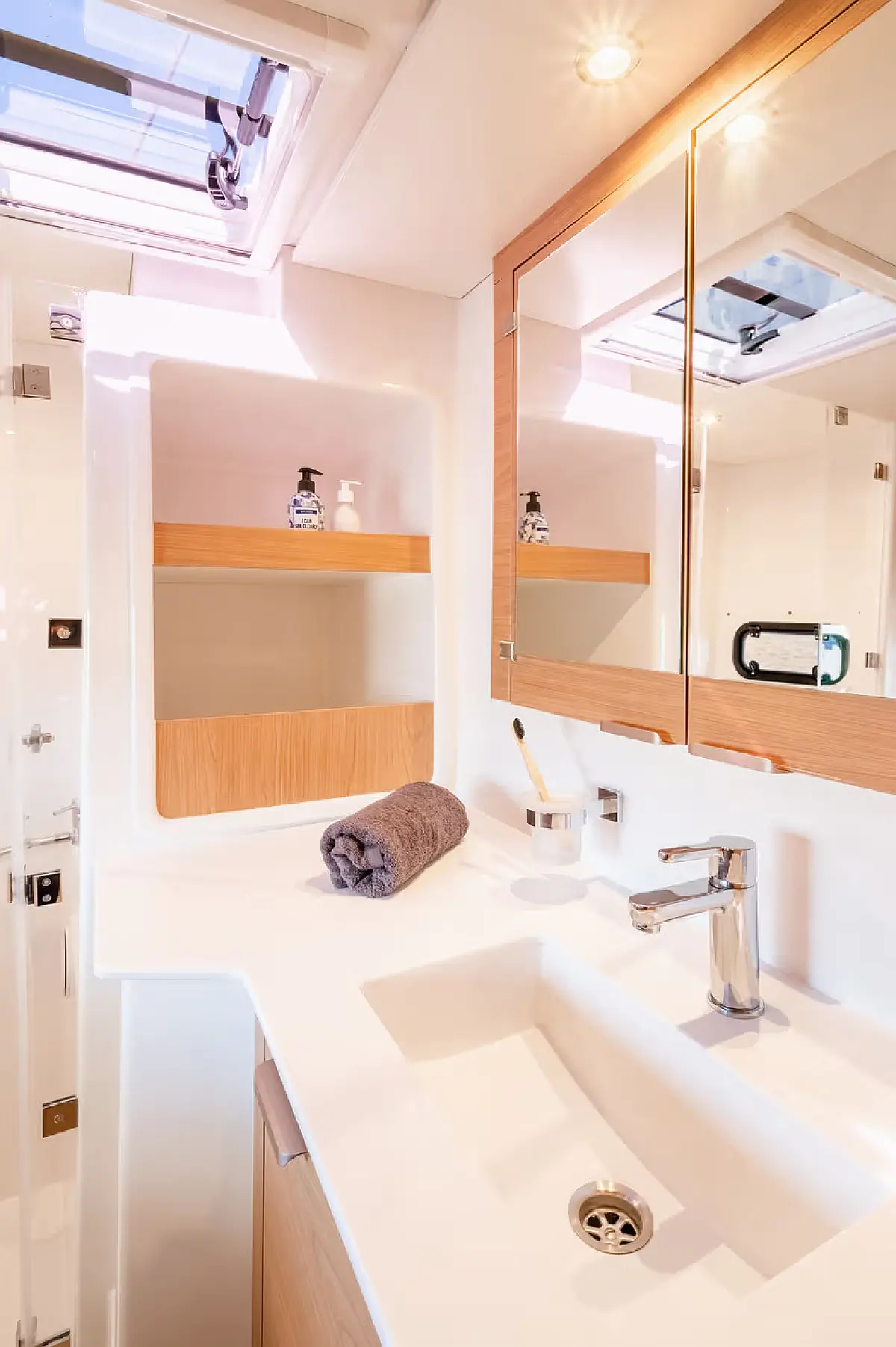 Klima , Hladnjak , Desalinizator , Generator , Pomoćni čamac , Inverter , Električna vitla , Vanbrodski motor , Električni WC , Bimini , Solarni paneli